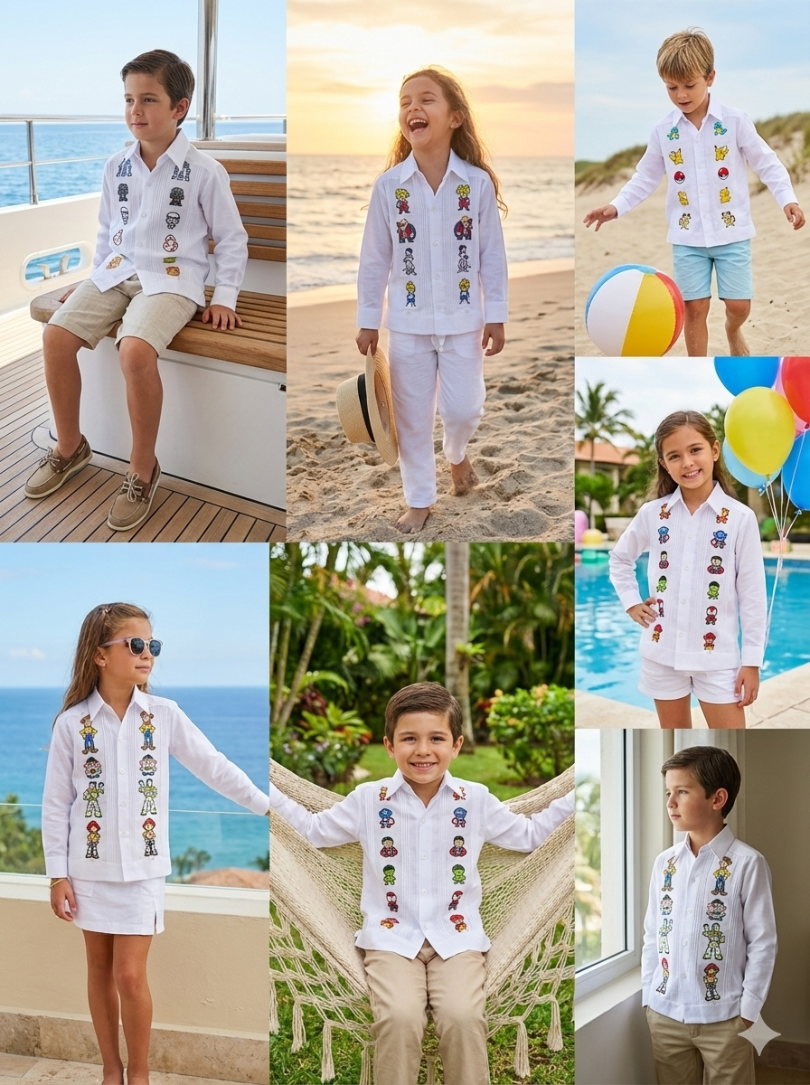 Nuestras guayaberas, diseñadas para adultos y niños, combinan la elegancia de un clásico con la magia de personajes infantiles, asegurando un estilo único y divertido.